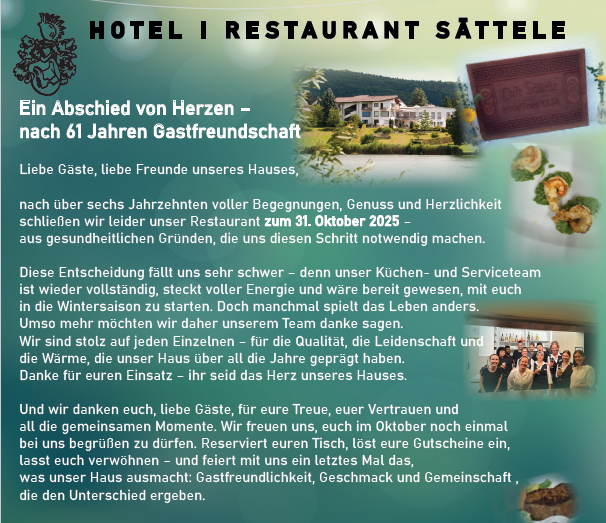 schließen wir leider unser Restaurant zum 31. Oktober 2025 aus gesundheitlichen Gründen, die uns diesen Schritt notwendig machen.