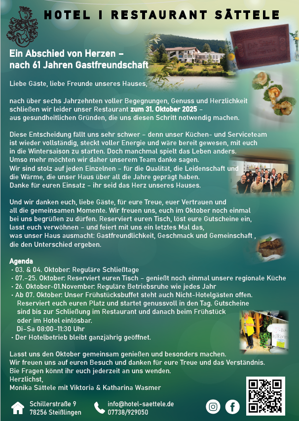 Und wir danken euch, liebe Gäste, für eure Treue, euer Vertrauen und all die gemeinsamen Momente. Wir freuen uns, euch im Oktober noch einmal bei uns begrüßen zu dürfen. Reserviert euren Tisch, löst eure Gutscheine ein, lasst euch verwöhnen und feiert mit uns ein letztes Mal das, was unser Haus ausmacht: Gastfreundlichkeit, Geschmack und Gemeinschaft , die den Unterschied ergeben.